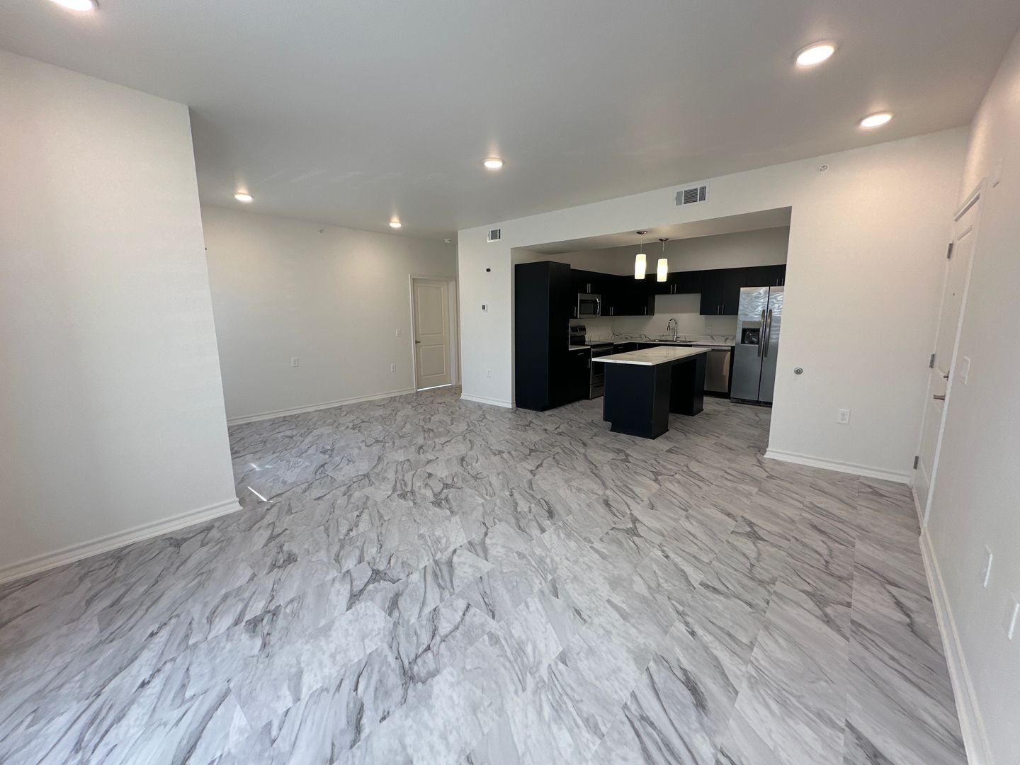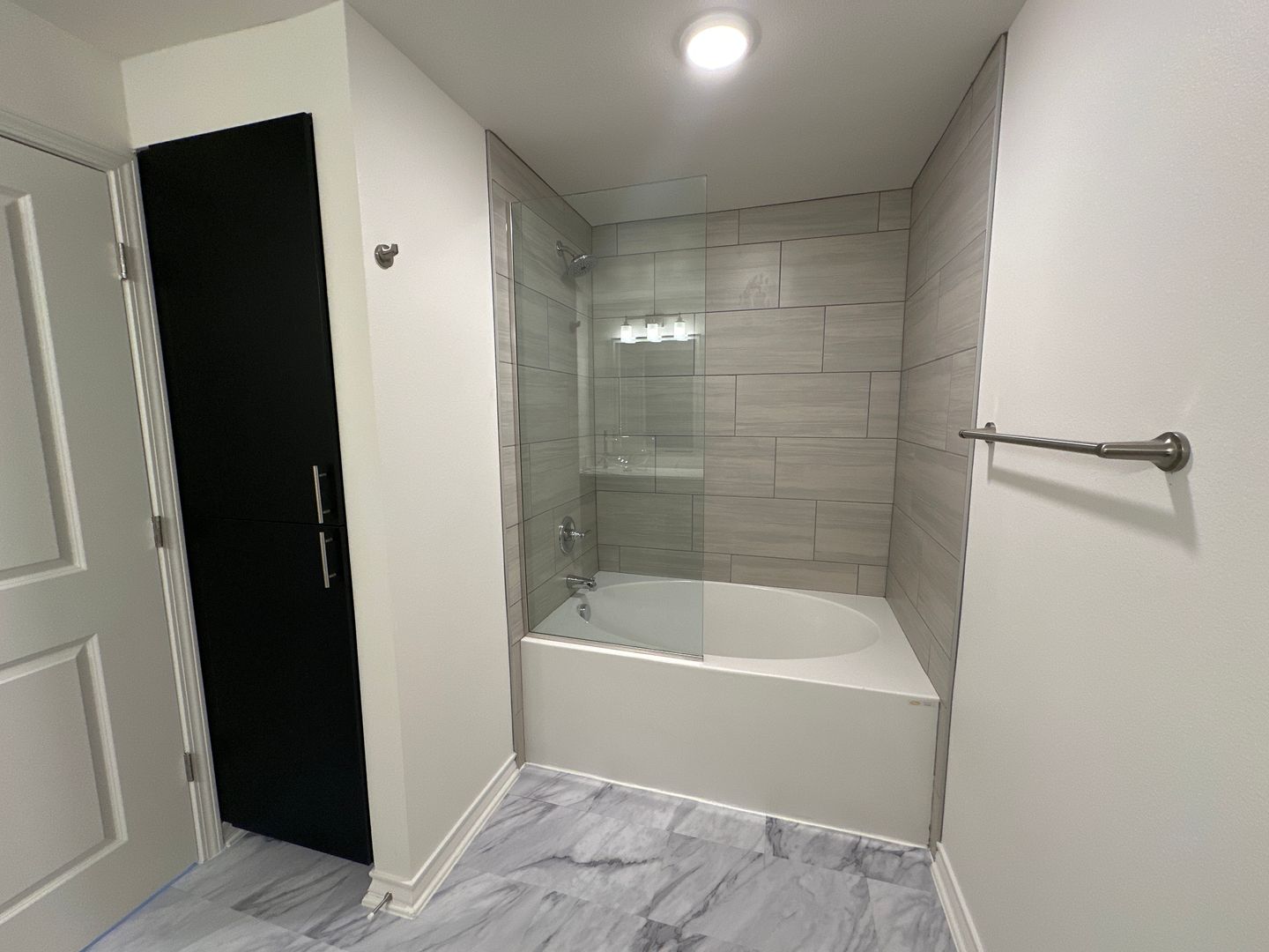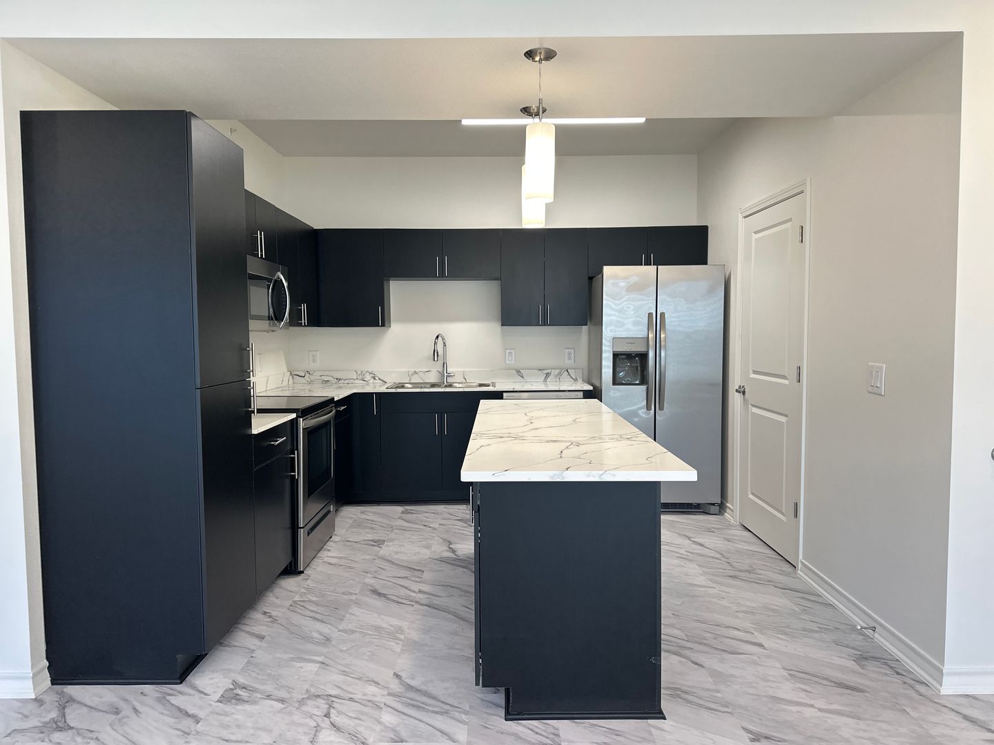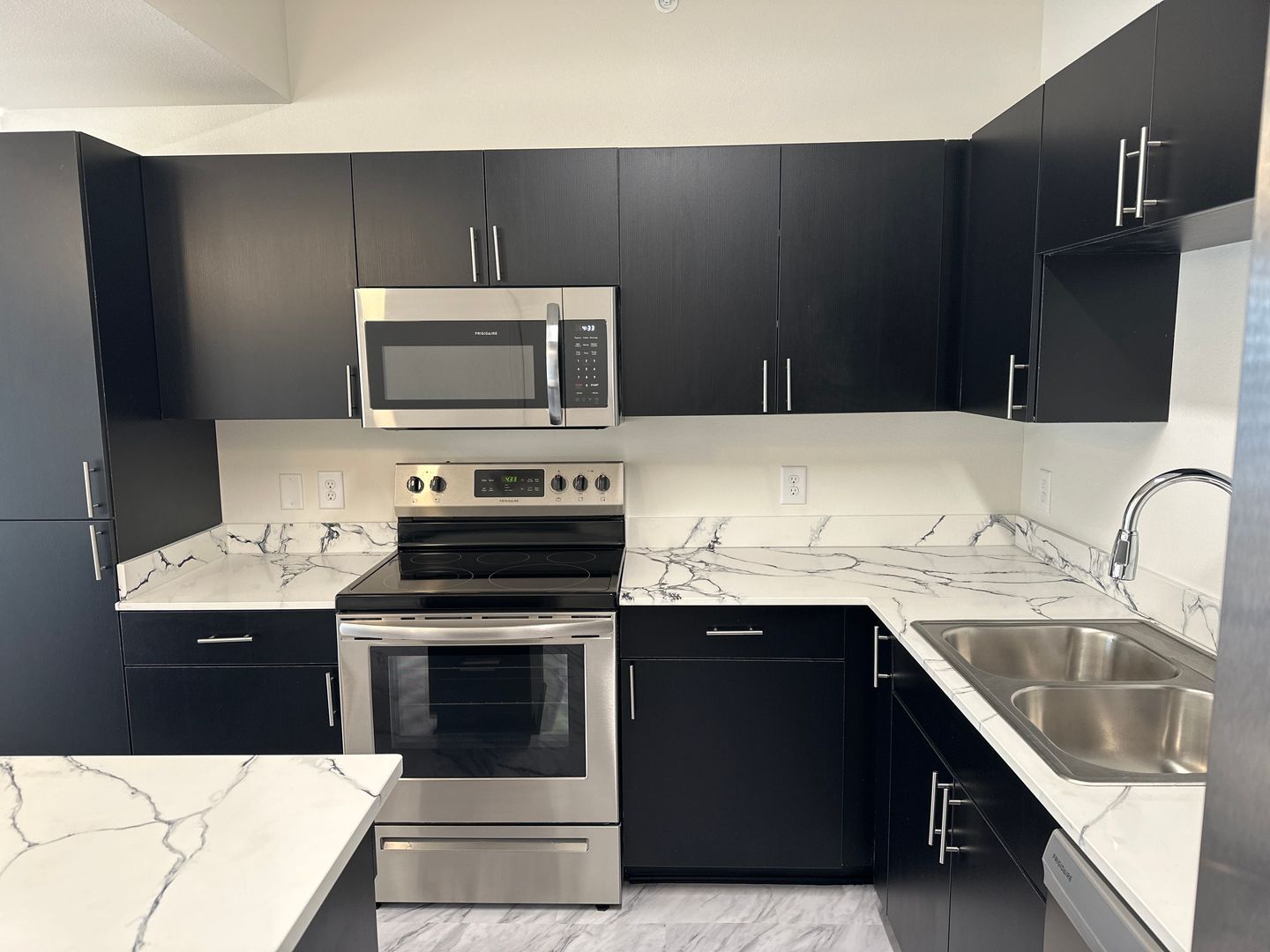 Spacious 1-bedroom apartment located on the 2nd floor (same level as parking lot) featuring black cabinetry, white quartz countertops, and grey faux-marble flooring throughout. The bathroom includes a garden tub/shower combination.