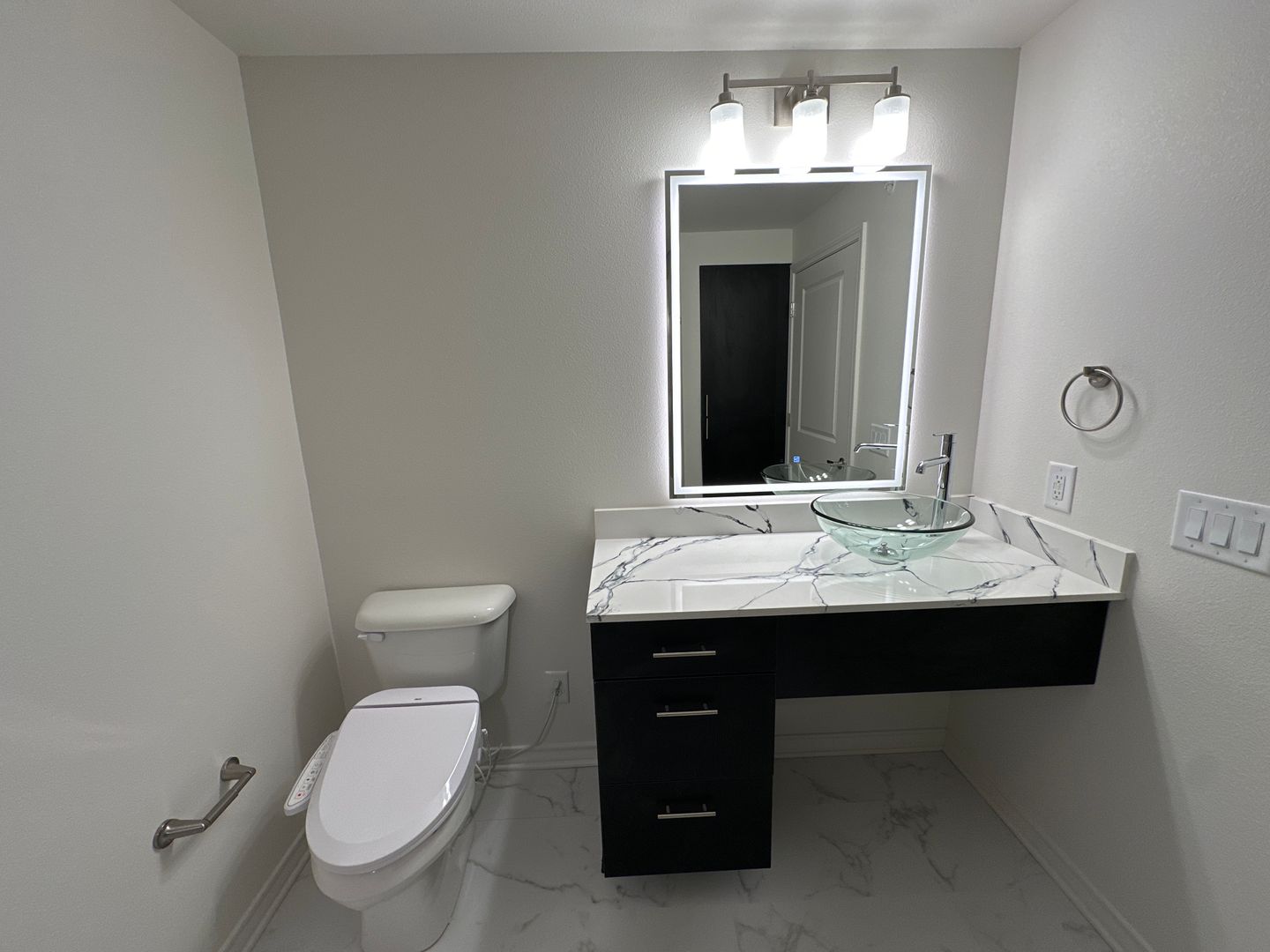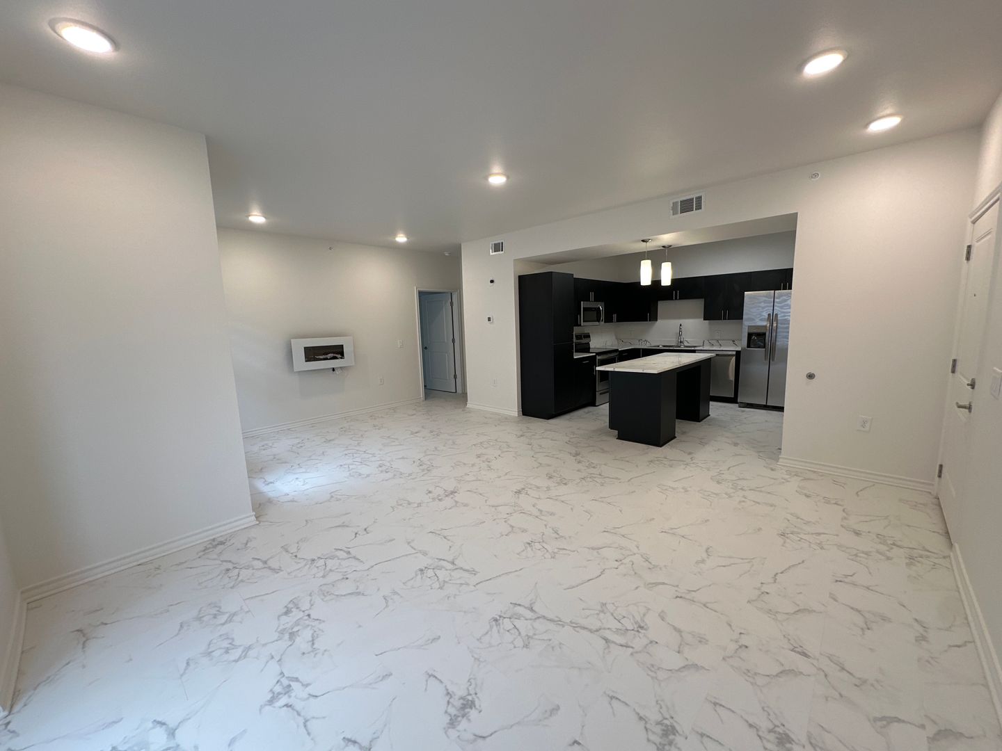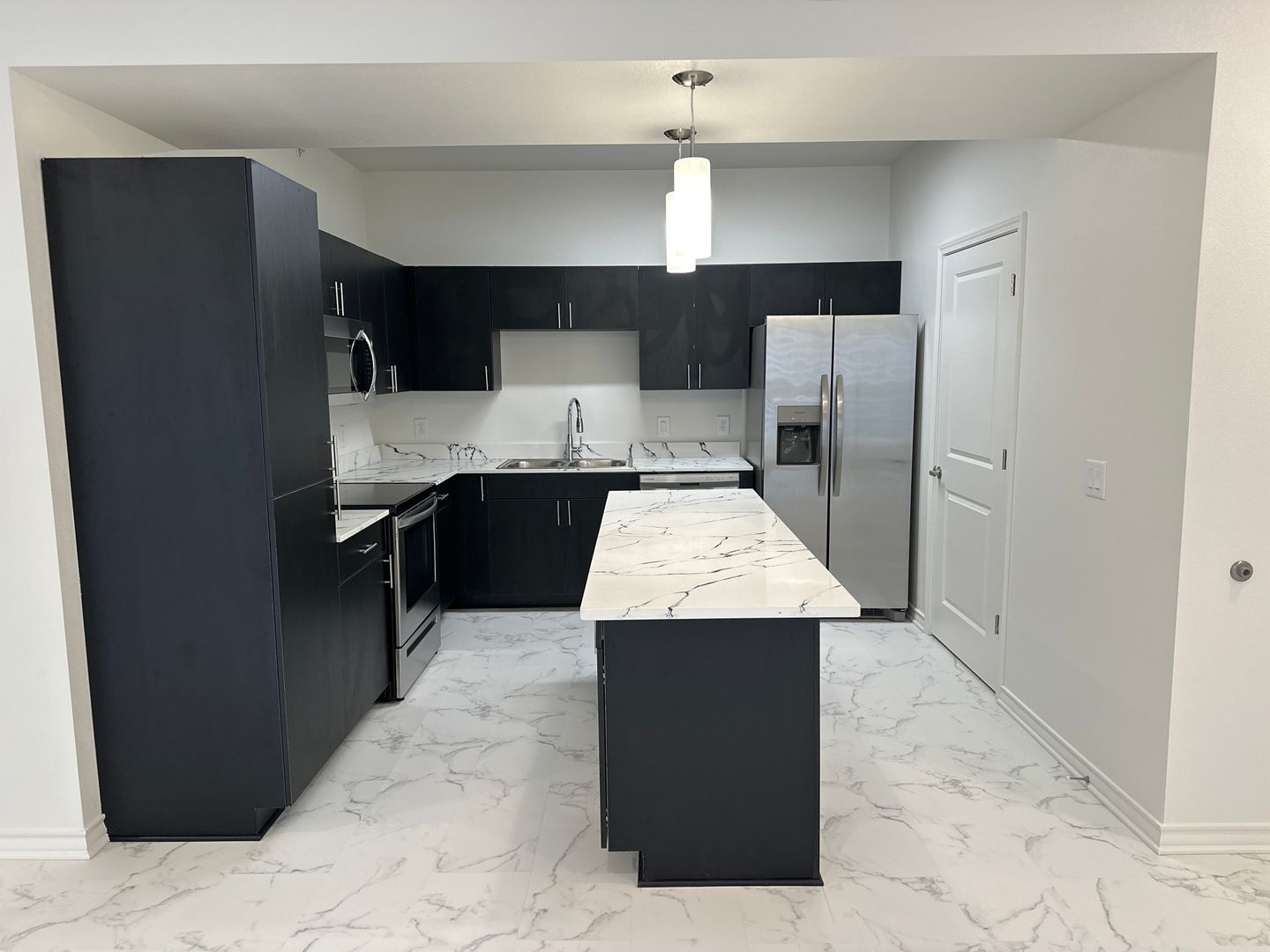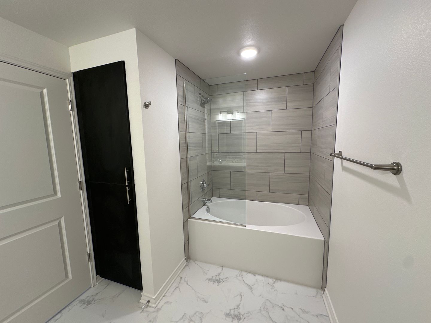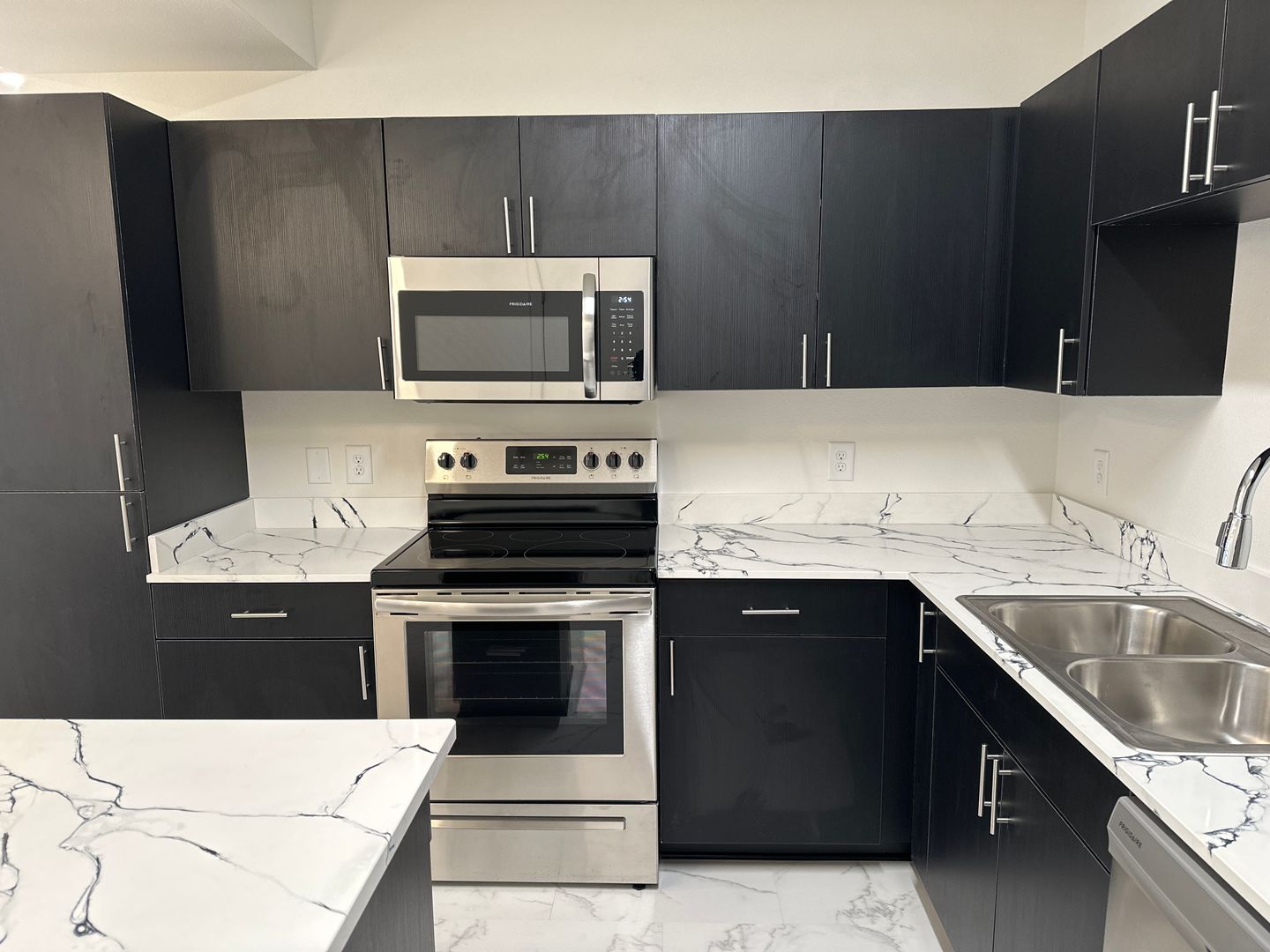Spacious 1-bedroom apartment located on the 2nd floor (same level as parking lot) featuring black cabinetry, white quartz countertops, and grey faux-marble flooring throughout. The bathroom includes a garden tub/shower combination.