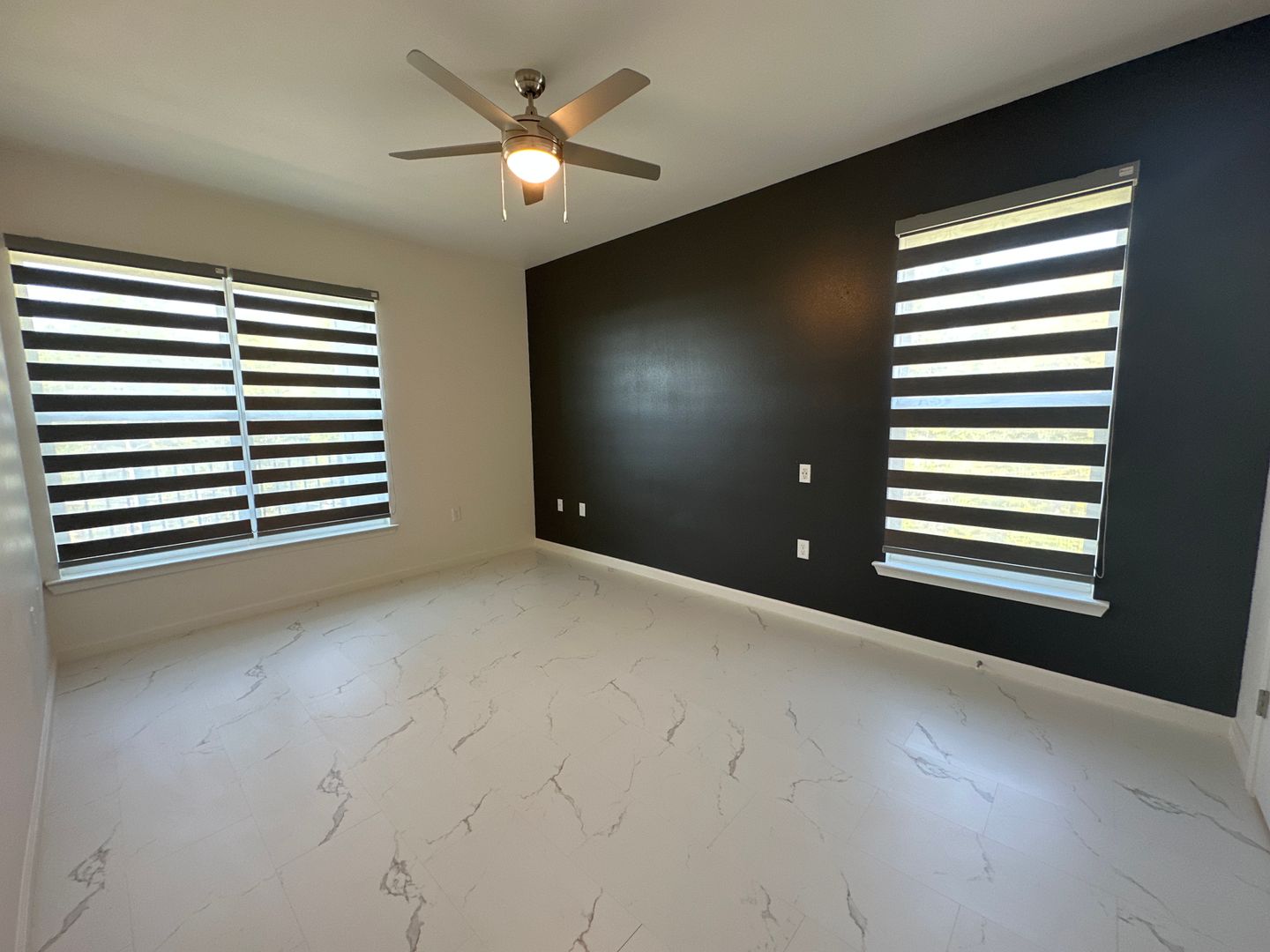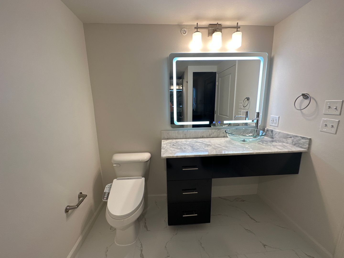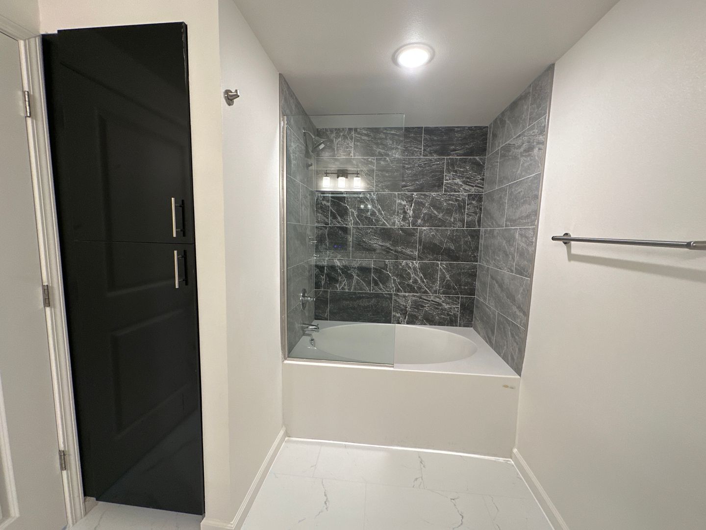 Spacious 1-bedroom apartment located on the third floor featuring black cabinetry, white granite countertops, and white faux-marble flooring throughout. The bathroom includes a garden tub/shower combination.